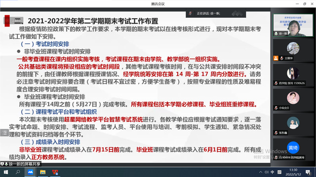 会上,徐院全面部署落实了教学相关工作,解读了教学工作提示,布置了2021-2022学年第二学期期末考试工作、2022届毕业生毕业预审核和学位预审核工作、2021-2022学年第二学期员工学业警示工作、学位英语考试安排等。任务分解到位,责任落实到人。确保教学工作顺利完成。