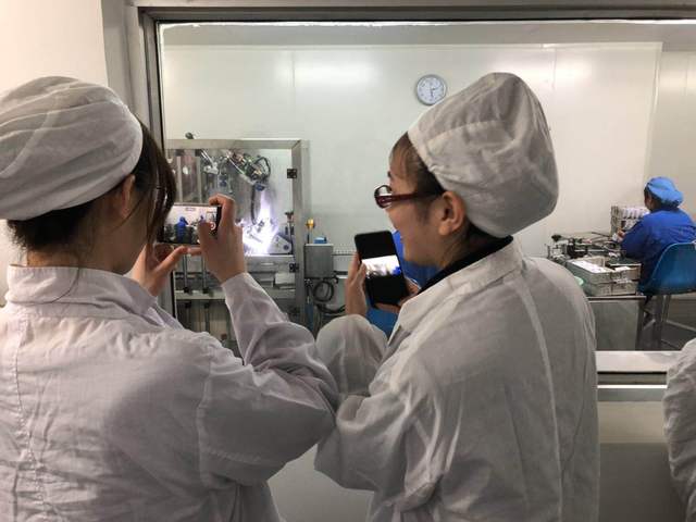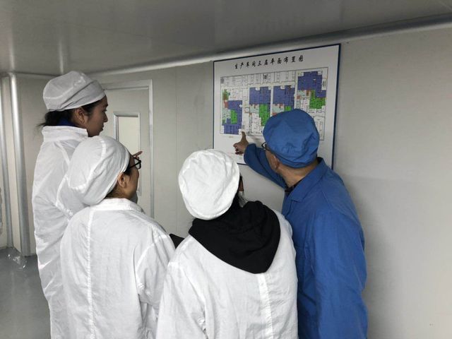 接着,企业工作人员带领师生参观了生产车间和质量部等企业机构。大家首先来到制水车间,亲眼目睹了原水经原水泵依次通过多介质过滤器、活性炭过滤器、然后到达阳离子交换树脂、再经反渗透膜(RO膜)形成纯化水,并以蒸馏方式将纯化水再次生成注射用水的过程,GMP课程上生涩难懂的纯化水制备、注射用水的制备在此一目了然,鲜明生动。同学们在真实工作环境中,通过现场教学,理论知识得以巩固加强。生产车间的外围设有“参观走廊”,是独立的参观人流通道,不和生产人员的进出通道共用,避免了药品生产中可能的交叉污染。同学们行走在参观走廊,参观着旭东海普的小容量注射剂产品的自动洗瓶、装盘、灭菌、灯检、包装、装箱、入库等工序的操作,在岗位上驻足停留,并不时与生产人员交流讨论。