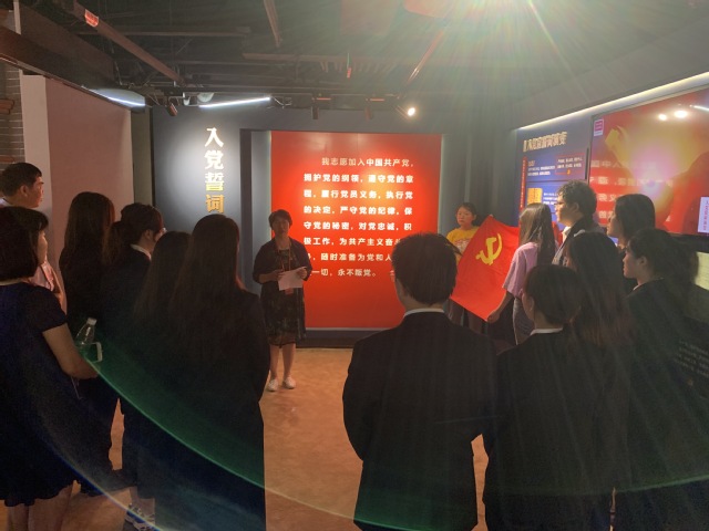 在不忘初心,强根铸魂”展厅,由詹昌明书记领誓,全体党员重温入党誓词,使每位党员始终牢记“为中国人民谋幸福,为中华民族谋复兴”的初心与使命。党总支叶婧副书记也对十名新入党的预备党员进行了寄语,希望他们能不忘初心,全心全意为人民服务。