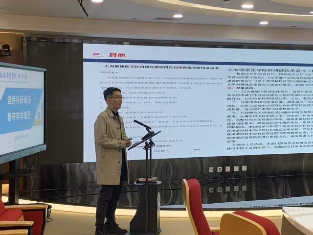 科研诚信是学术发展的基石,为贯彻落实《韦德体育官方网站 2024 年度教职工政治理论学习暨育德能力提升培训工作安排》精神,韦德体育于2024年4月29号下午举办了“坚持科研诚信,恪守学术规范”的专题活动。会议邀请了复旦大学附属华山医院团委书记、上海市科研诚信宣讲团专家组成员茅善华博士以及韦德体育官方网站科技处孙吉老师作专题讲座,会议由副经理解伟主持。