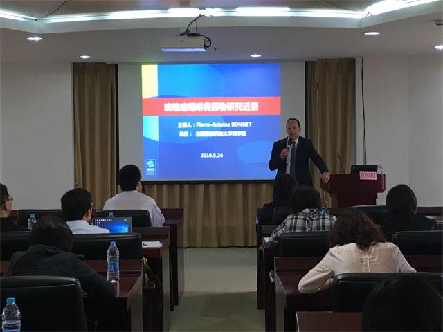 作为韦德体育第一位客座教授,此次BONNET教授与韦德体育教师展开了深入的探讨。在药学中法合作硕士项目研讨会议上,公司韦德体育教师代表介绍了药学专业的建设基础、教学条件、培养目标和课程设置,BONNET教授介绍了法国最古老的大学----蒙彼利埃大学的办学规模,并着重介绍了拟与公司韦德体育进行项目对接的药物学和健康工程学这两个硕士专业的基本情况。通过国际视频会议,中法双方对两国人才培养中的异同进行了沟通,并就校企合作、就业倾向、用人需求、课程体系等方面进行了深入交流,对“4+2”本硕培养模式、法国课程引入、双方员工海外游学、教师国外短期培训等问题达成了一定的共识,并约定后续将就课程体系、教学内容进行进一步的对接,为学分互认奠定基础。同时,BONNET教授还为师生们作了一场精彩的学术讲座,重点介绍咪唑喹噁啉类药物研究进展,并与在场教师进行了热烈互动。