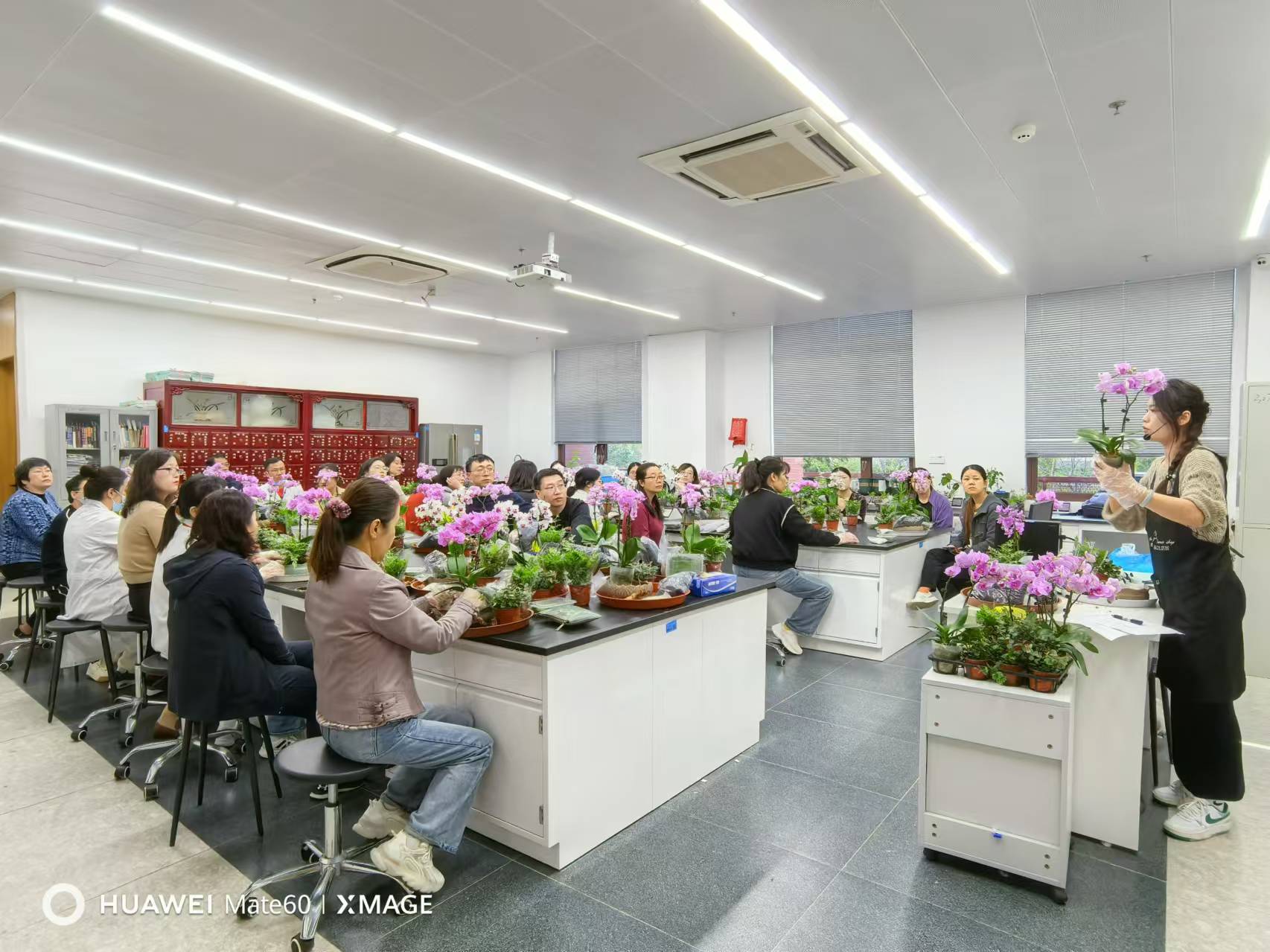 活动当天,活动室桌面上摆满了形态各异的蝴蝶兰和花艺工具。花艺老师首先为大家介绍了蝴蝶兰养护知识,园艺盆栽种植的基本流程和步骤,以及塑造造型优美的盆景技法、色彩搭配,左右、前后、高低布局等知识。最后强调了兰花养护的关键四点:少浇水,弱光照,短修剪,去空根。