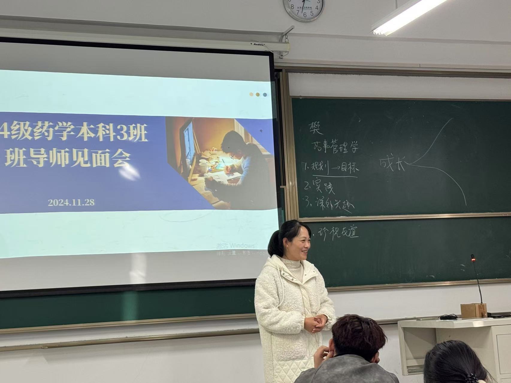 2024年11月28日下午1点,韦德体育2024级药学本科3班在南苑E104教室举行了本学期第一次校内班导师见面会,本科班导师樊玉录、辅导员袁恺文参加本次见面会。药事管理专业樊玉录老师从自身的专业视野出发向2024级药学本科3班的同学们介绍了药事管理学这门学科,并结合自身学业成长经历,对同学们未来的规划进行指导。