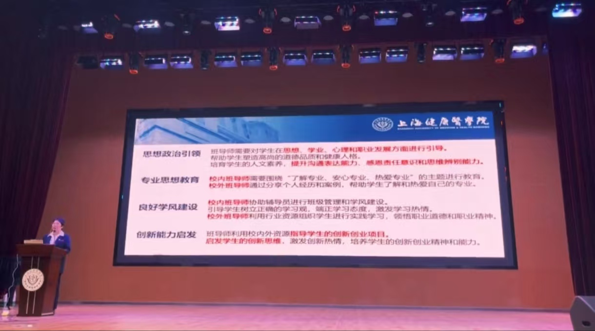 2024级新生班导师聘任仪式上,药公司党总支副书记叶婧致辞。首先,叶书记强调了班导师制度的重要性,并对新任班导师们表达了期望和信任。接着,叶书记介绍了现阶段班导师的工作内容和职责:一是思想政治引领,二是专业思想教育,三是良好学风建设,四是创新能力启发。她指出班导师要将培养员工的文化知识、专业技能和人格素养并重,应给予员工职业发展的指导、帮助员工了解专业发展前景,及时提供行业企业的信息资讯,提升员工对培养方案的认同度,帮助员工清晰未来规划。