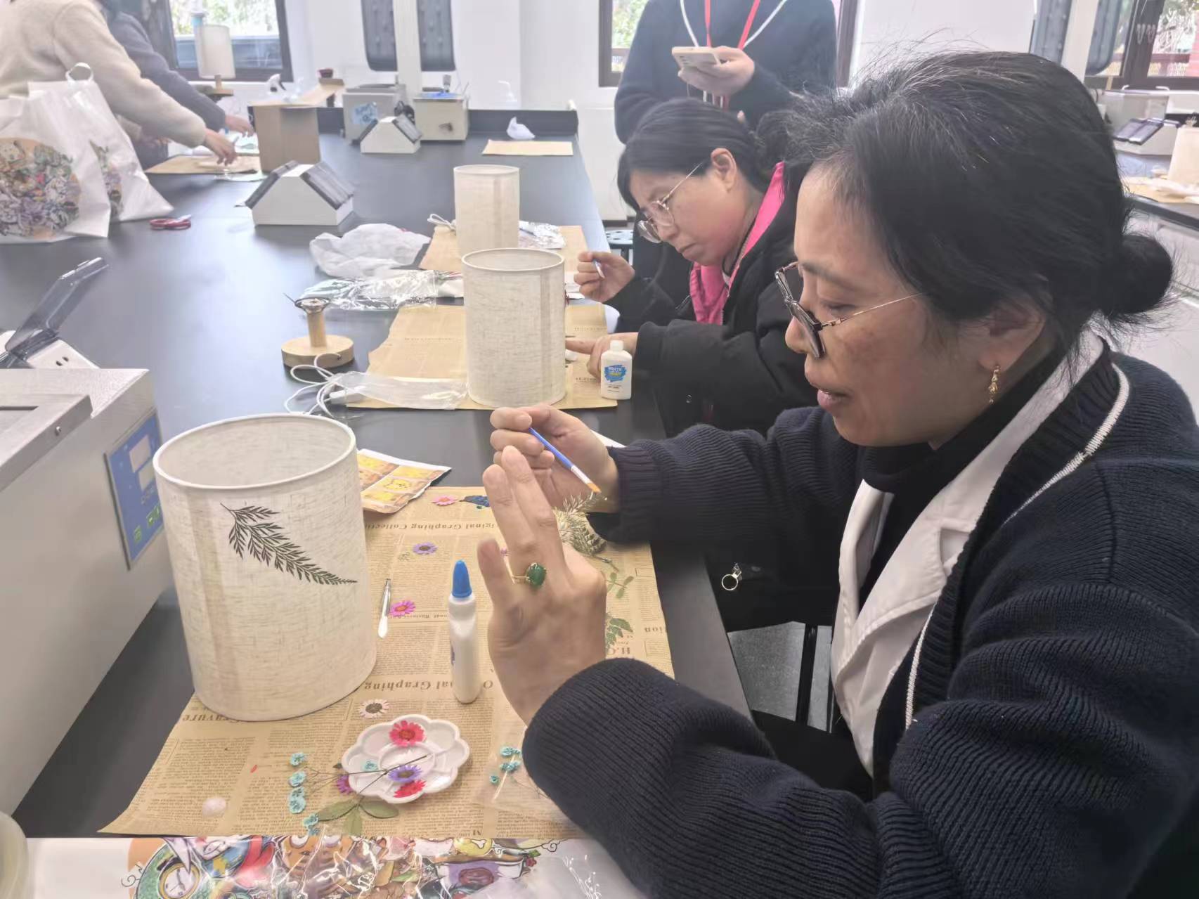 活动现场,花艺老师首先为大家详细讲解了压花艺术的历史渊源、制作技巧以及草本台灯的组装方法。随后,教职工们迫不及待地挑选自己心仪的干花材料,开启创作之旅。大家充分发挥想象力,将五彩斑斓的花瓣、枝叶巧妙组合,有的拼成浪漫的花朵图案,有的组成富有诗意的自然景观,每一个设计都独一无二,饱含着创作者的巧思。 柔和的灯光透过透明灯罩,与压花相互映衬,散发出温馨而迷人的气息,为节日增添了一抹别样的浪漫。