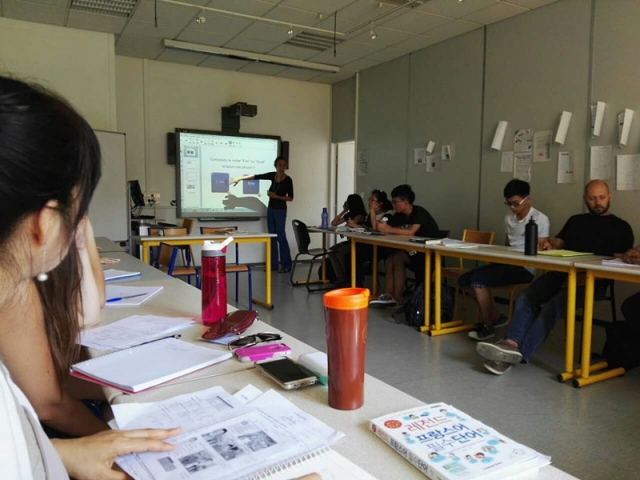 第一周的课程主要是听说读写基础练习。虽然每天四个小时的授课时间不长,但是让我们体验到了截然不同的教学氛围。传统的讲座式引导往往乏味无趣,同学们听完之后仍然不会记得多少,但在这里,老师会把我们分成两两一个小组,必须要与来自不同国家的员工搭档,并且只能说法语,通过小游戏和对话练习,使我们在轻松的氛围中调整好状态,尽快融入课堂。之后,我们还去了视听教室练习听力,进一步巩固和提升当天学习的语言知识。