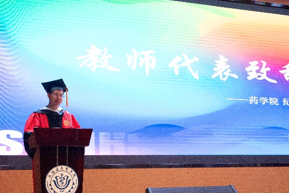 教师代表纪万里副教授结合自身科研经历,以“永葆好奇心,做终身学习者”为题发言。他幽默回忆了指导员工实验的趣事,以师者身份、亦以挚友姿态,向毕业生倾诉心声。并寄语毕业生:“药学是守护人类健康的基石,愿你们以严谨和创新回应时代需求。”