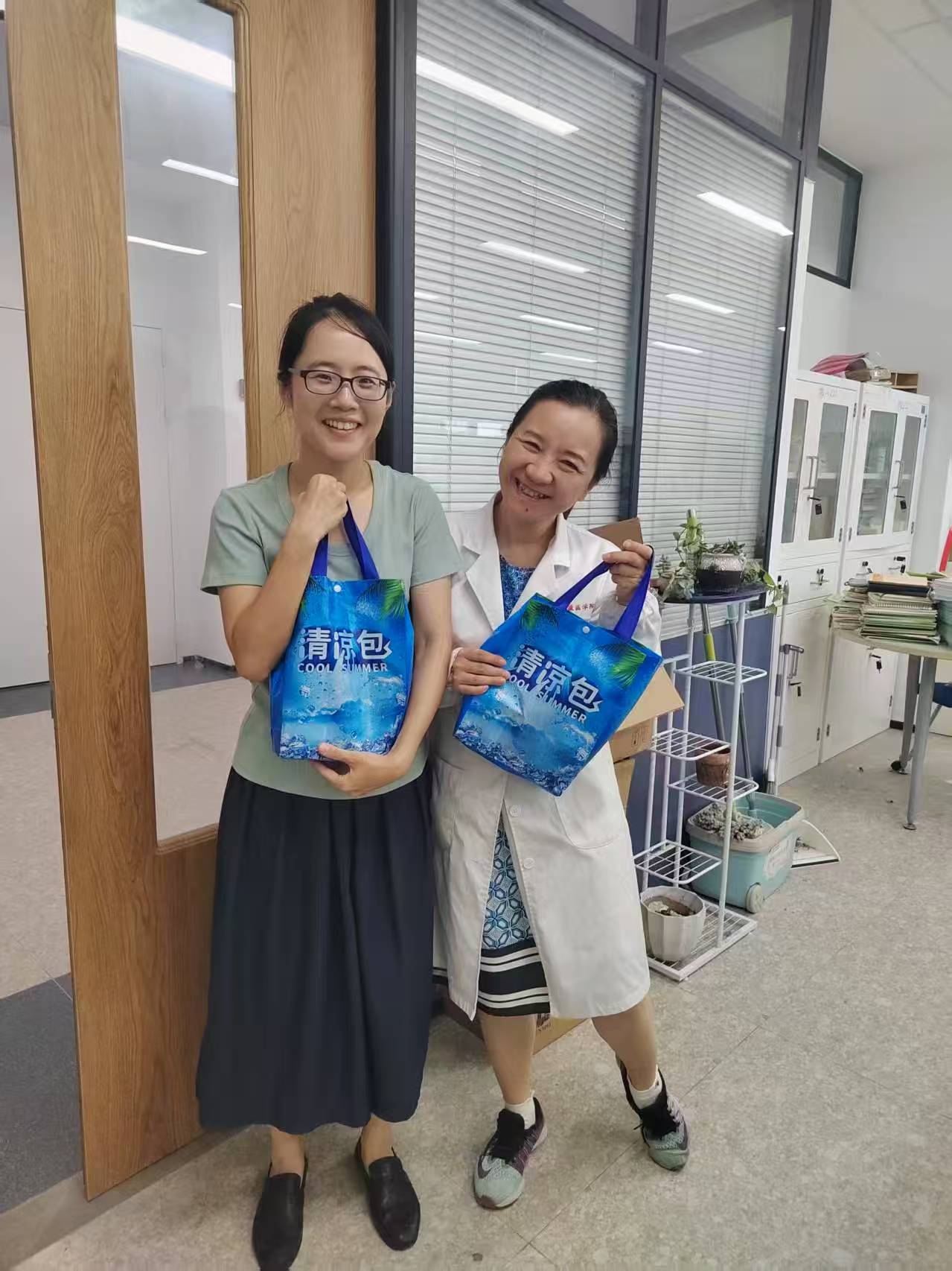 公司工会提前谋划,积极组织调研,根据老师们需求采购防暑降温物资。药公司党总支书记徐一新、工会主席陈晓晶一起深入各教研室、实验室,为在炎炎夏天坚守岗位的吴锴、亓雪等20多位教职工送上清凉包,并与大家亲切交流,了解教学工作情况。