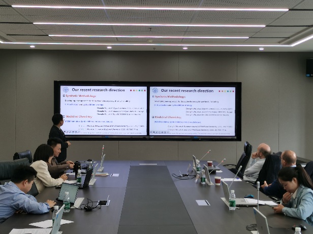 交流会上,来自药物化学、药物分析、无机化学、微生物与生化药学等教研室的9位科研骨干进行了精彩的学术报告。每位汇报人围绕其研究方向进行阐述,现场讨论气氛活跃,思维碰撞激烈。其中,郑兰红副教授分享了课题组在海洋微生物天然产物挖掘方面的最新进展。吴锴副教授汇报了酶分子的计算设计及其在抗癌药拉罗替尼合成中的应用成果。纪万里副教授围绕我国特色中药铁皮石斛中有效成分的分析与鉴定进行研究,研究内容引起法方专家的极大兴趣,双方就石斛的品种与鉴定等进行了深入交流。李晓娜博士报告了发表在化学顶级期刊《德国应用化学》封面的成果,其在复杂糖链的合成上取得的重要突破受到法方专家的高度认可。吴成林和李凯迪博士分别介绍了课题组在C-H活化领域的最新研究进展及在神经退行性疾病药物开发方面的成果,并与法方专家深入交流。张静副教授围绕胍类化合物的化员工物学方向研究进行了系统汇报。来自药物分析教研室的贾冬玲副教授汇报了一种金属修饰的新型纳米材料及其催化性能;张宇博士报告的关于新型抗氧化材料研究成果展示了其促进伤口愈合的良好效果,引发了与会专家的浓厚兴趣。最后,Masurier教授为大家带来了题为《激肽释放酶相关酶抑制剂的开发》(Development of Kallikrein-related peptidases inhibitors)的学术报告,深入浅出地介绍了其在相关领域的最新研究成果,引发了与会青年教师的热烈讨论。