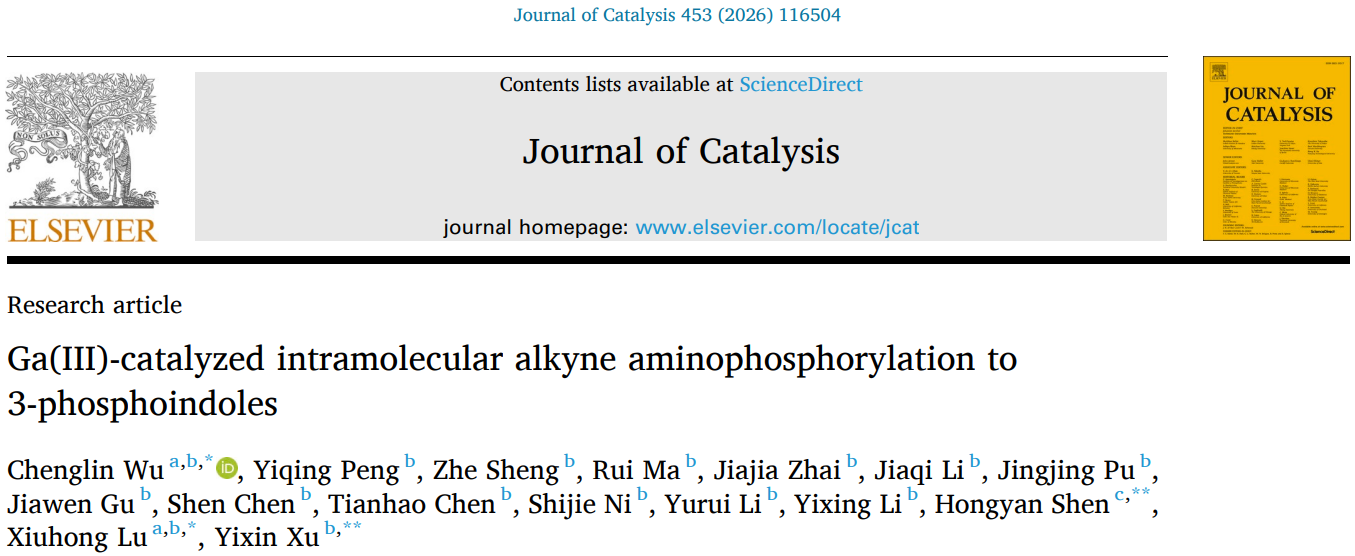 近些年,过渡金属催化的分子内的N−X(X =元素)键对炔键的加成能够高效构建具有潜在药理活性的官能团化吲哚衍生物。例如,通过N−B、N−C与N−S键对炔键的加成,可分别实现3-硼基吲哚、3-酰基吲哚及3-磺酰基吲哚的合成。但N−P键对炔键的加成至今是科研界未解决的难题。近日,公司青年教师吴成林在《Journal of Catalysis》上发表题为《Ga(III)-catalyzed intramolecular alkyne aminophosphorylation to 3-phosphoindoles》的研究论文,韦德体育2021级药学专业本科生彭怡清为共同一作。研究首次揭示了分子内N−P键对炔键的加成,高效合成了一系列3-磷酰基吲哚(图2)。这一突破标志着该类型反应在催化合成领域取得了重要进展。