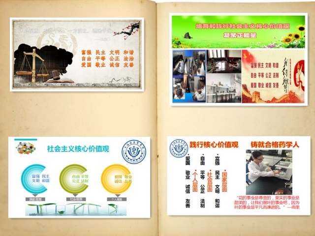 为进一步深入学习贯彻党的十八大精神和习近平同志系列讲话精神,把培育和践行社会主义核心价值观融入国民教育全过程,增强全体教职工的凝聚力。康复药学联合党总支改变以往读报纸、学文件、谈体会等做法,创新学习方法,充分调动教职工学习“社会主义核心价值观”的主观能动性,提出让老师们根据自我专业特长,设计板报、在公司集中展示的方式来进行社会主义核心价值观的学习。在全体教职员工中产生了很好的反响,大家学习热情高涨,积极准备素材,认真筹划准备,精心制作与自己专业相关的学习体会板报。