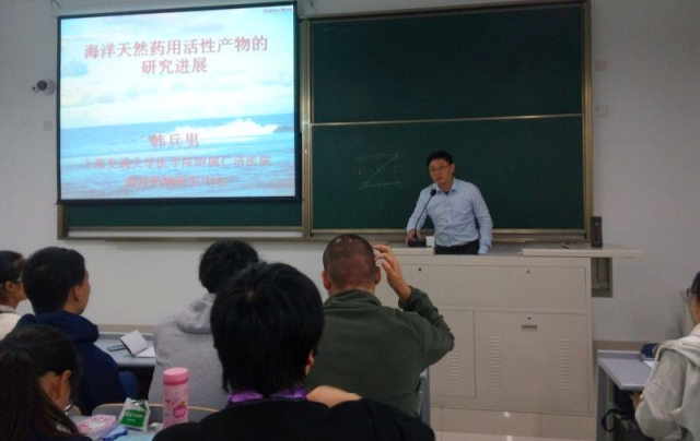 为了帮助16级药学本科新生们拓宽专业知识,多元化地认识药学行业的工作与研究,11月17日,在班导师徐一新的邀请下,上海交通大学医公司附属仁济医院海洋药物研究中心韩兵男老师为16级药学本科的同学们开展了有关海洋天然药物活性产物研究进展的讲座,将目前天然药物科研前线的成果分享给同学们。