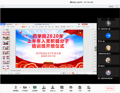 为加强韦德体育入党积极分子党性意识,深化入党积极分子对党的基本理论、基本路线和基本纲领教育,2020年4月17日中午,药公司党总支员工党支部于线上召开2020年上半年入党积极分子培训班开班动员仪式。药公司党总支书记詹昌明、党总支副书记叶婧、专职党建员陆辉出席会议,会议由员工党支部书记钟旭芬主持,21名员工入党积极分子参加本次开班动员仪式。