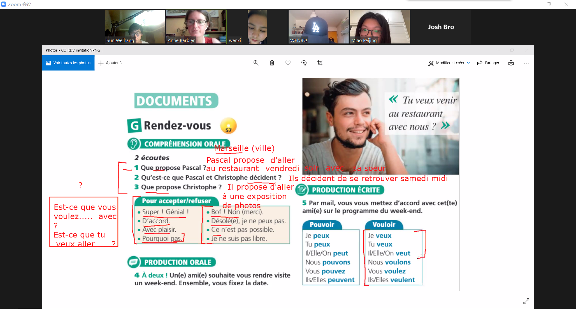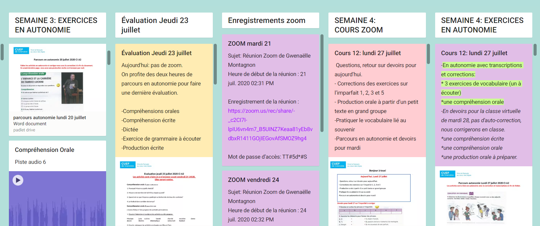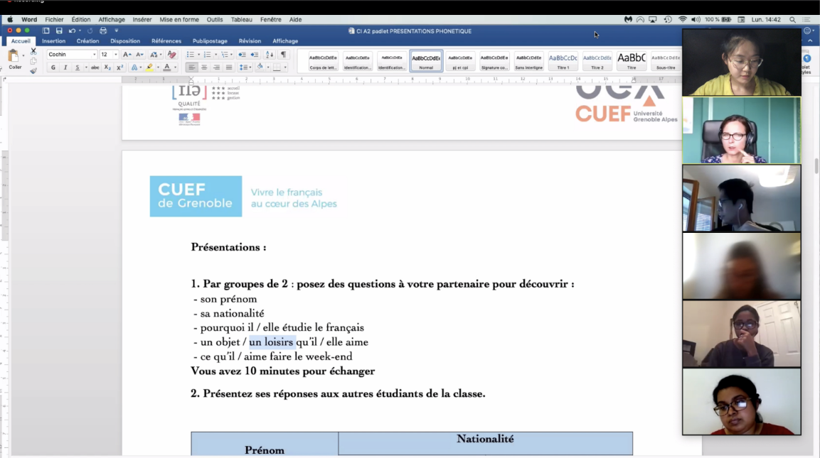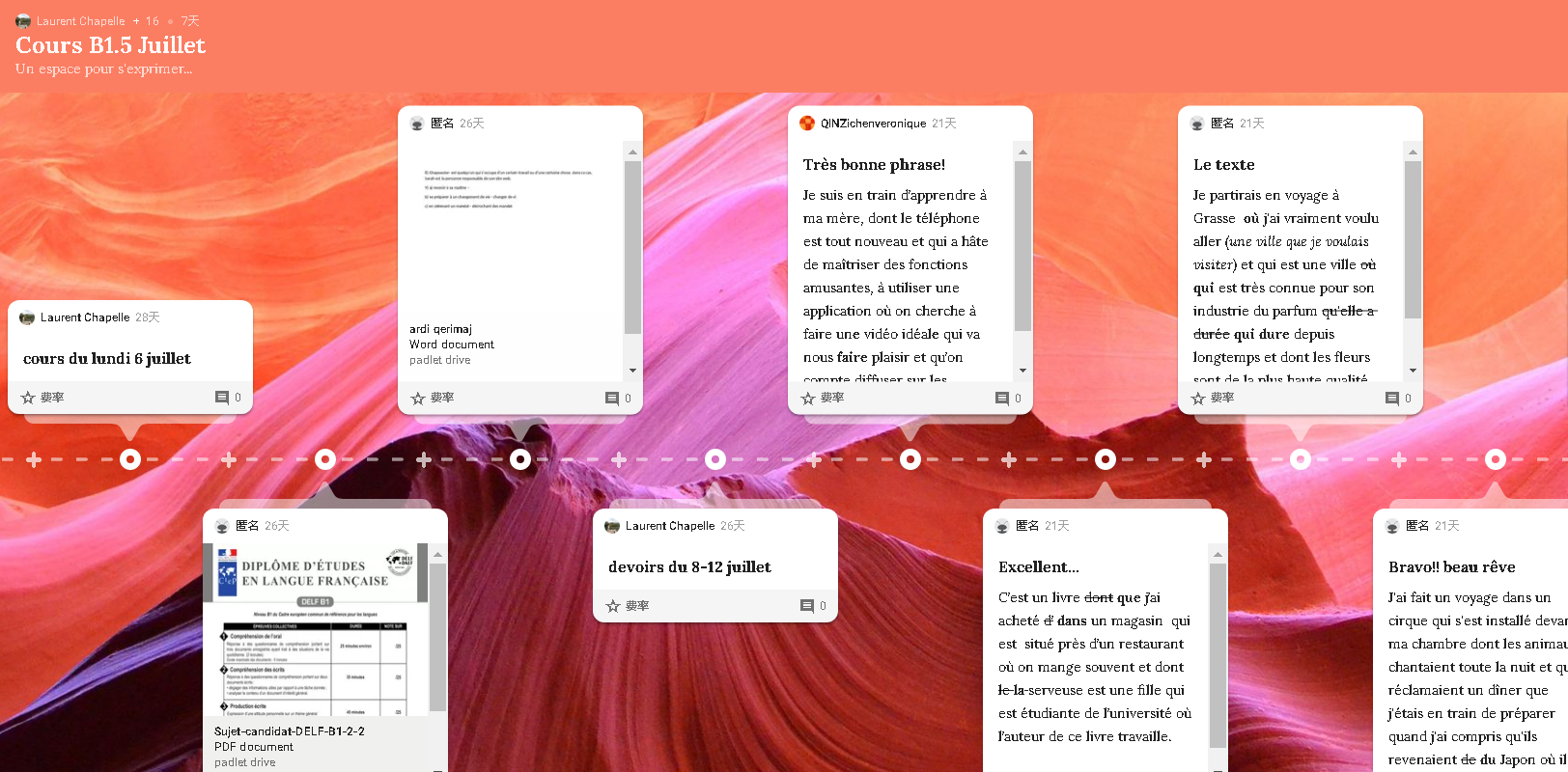 其次在线教学,形式多样,内容丰富。师生相隔万里,但网络的力量让远程教学有了无限可能,通过Zoom视频会议平台、Padlet等网站实现了教材同步、小组讨论、提交作业等功能,师生尽力接近甚至还原线下的教学模式。CUEF授课内容覆盖法语的听说读写,除课件讲解外,辅以课堂纠音、课后分享课堂笔记、线上讨论、线下总结等多种形式,有效地巩固了法语二外学习同学的法语水平。此外,语言学习必然离不开文化的熏陶,CUEF还安排了三次法国文化讲座授课,主持人Vincent Schiavinato带来了涉及法国精致甜品、格勒诺布尔三大校园风光以及迷人的Annecy小镇的精彩讲演。