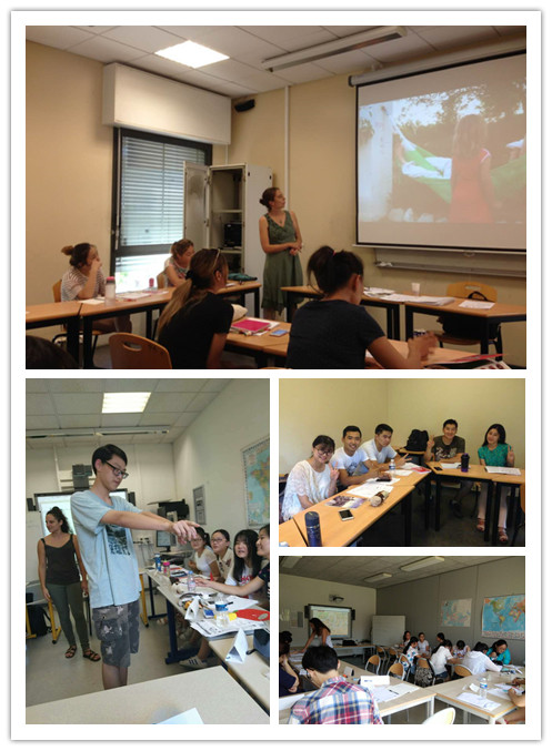 老师纯法语的授课,最初令我们不适应,但随着语感的提高和课次的增加,我们开始逐渐习惯。在老师的鼓舞下我们能说会答,伴随着游戏的互动以及形象的视频听力练习让原本有些拘谨的课堂变得生气勃勃。在讲解方位名词的时候,为了加深印象,我们在法语课堂做了一个“蒙眼摸人”游戏,让一个闭着眼的同学依靠课上现学的方位术语找人;除此之外,还让几个同学听从一个指定的同学指挥呆到相应的位置并进行拍照,为此课堂留下纪念。