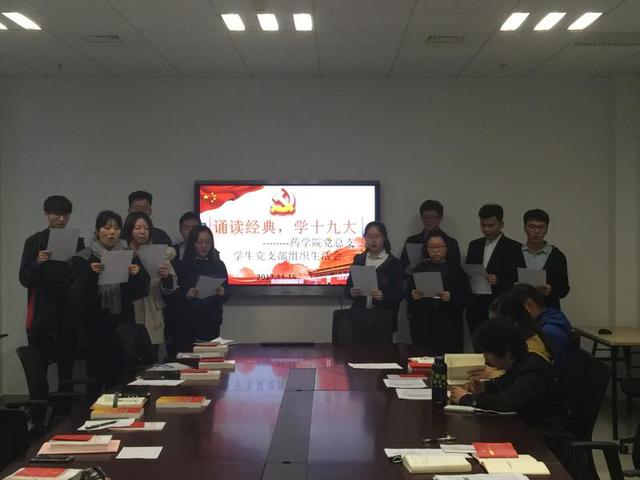为了学习宣传贯彻党的十九大报告精神,学懂弄通做实党的十九大精神,2017年11月16日,药公司党总支员工党支部开展了“诵读经典,学习贯彻党的十九大”的专题组织生活会。参加本次组织生活会的有党总支副书记叶婧,员工党支部书记邵真如,支部组织委员章蓓意、支部委员曹天晓、付艳君和孙云老师,以及七名员工预备党员和四名拟发展对象。