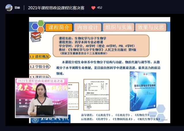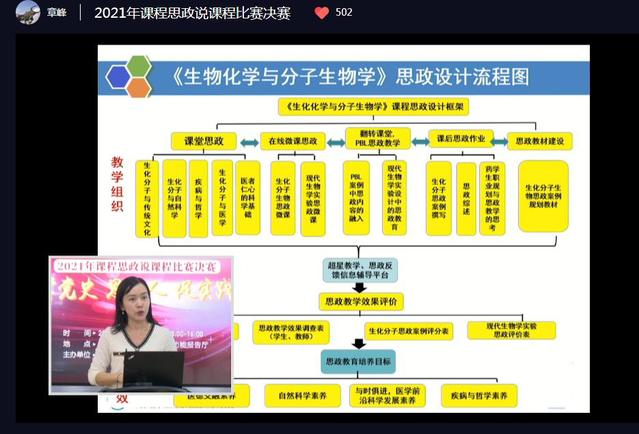 11月1日,韦德体育微生物与生化药学教研室主任梁蓓蓓副教授参加校课程思政竞赛决赛。梁蓓蓓老师从《生物化学与分子生物学》课程介绍、课程思政内容设计、组织实施、效果与反思几个方面对该课程思政内容进行了充分的论述,课程思政德育目标明确,能深入挖掘提炼课程内容中所蕴含的思政要素和德育功能,充分整合利用教学资源、实践教学条件等,实现灵活与进洞教学方法,以立德树人为重点,将思想政治教育与专业知识有机融合。