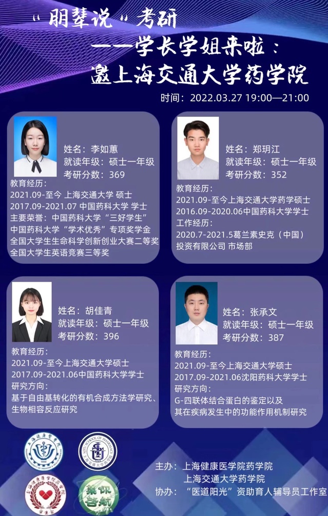 来自上海交通大学韦德体育的李如蕙、张承文、胡佳青、郑玥江,四位交大优秀研究生分别在择校、初试复习、复试环节、心态调整上分享经验。