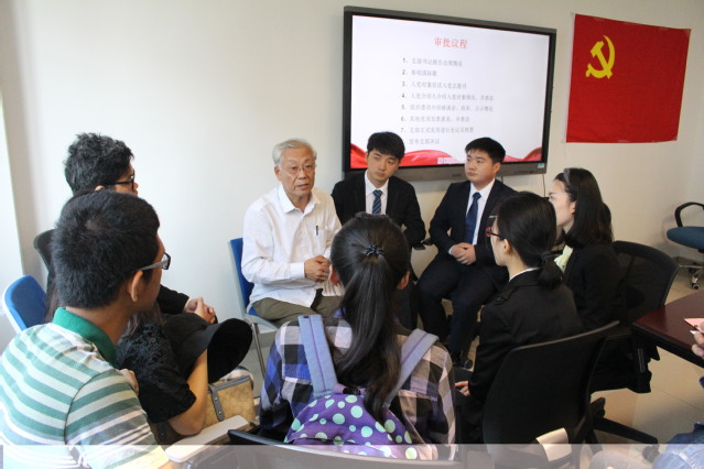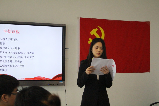 会议在激情昂扬的国际歌声中拉开帷幕,在庄严的党旗下,十位发展对象依次宣读了入党志愿书,他们就入党动机、培养期间现实表现以及自身的缺点等方面向党组织作了全面深刻的汇报。入党介绍人针对各自所联系的发展对象在思想、学习、工作上的表现进行了介绍,并对是否同意其入党进行了表态;党总支副书记叶婧介绍了座谈会、政审及公示情况。会上支部党员老师对发展对象的优点进行了肯定,更中肯地提出了他们的不足之处和改进建议。在投票表决环节,5名有表决权的党员一致同意接收蒲佳颖、熊家伟、曹宇、宋彦德、黄剑坤、陈麦秋、孙宇飞、应娜、梁艺露、王虎十名发展对象成为中共预备党员。